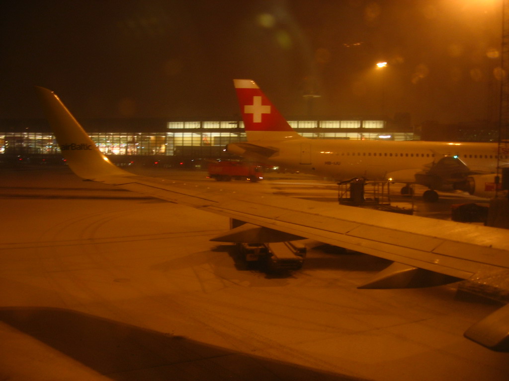 Самолет ЭйрСвисс приземлялся прямо за нами и рулил следом на стоянку, подсвечивая пейзаж сзади своими фарами. Как только он замер я нажал спуск на камере.